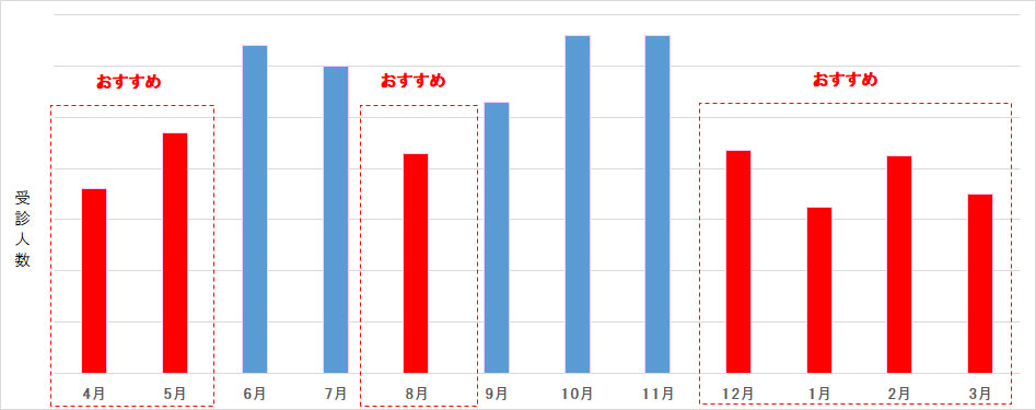4月、5月、8月、12月、1月、2月、3月は比較的受診人数が少ないため、待ち時間が少なく受診できる時期となります。