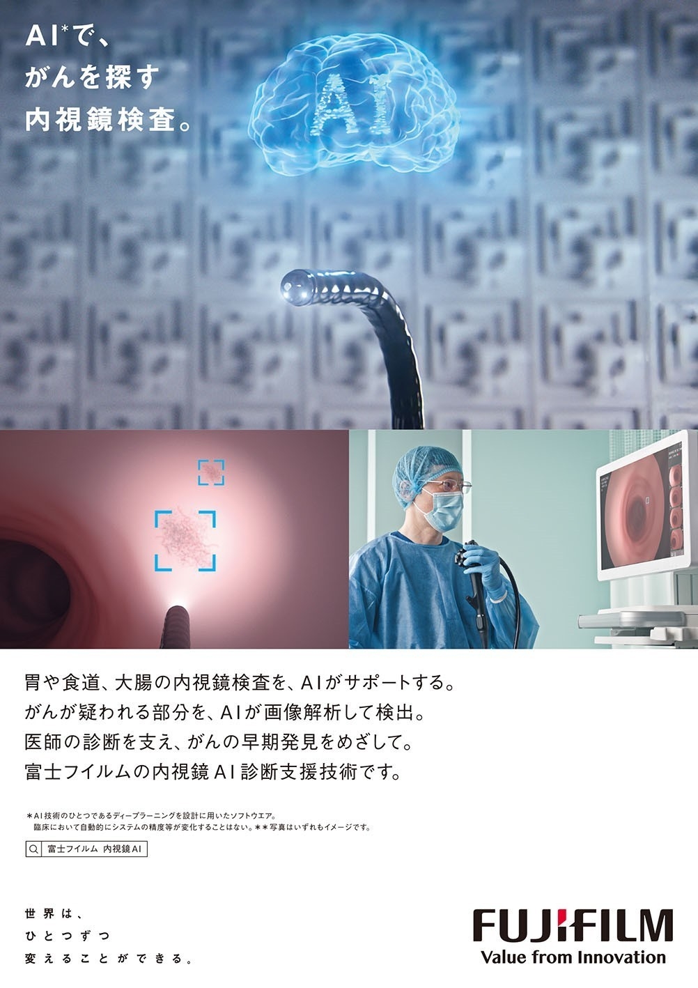 胃・食道の内視鏡検査中に、AIがリアルタイムで画像を解析し、医師が診断時に見るモニターに映し出される内視鏡映像に、「がんの疑いがある部分を表示」することで医師の診断を支えます。